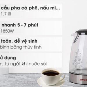 Bình đun siêu tốc Sunhouse thiết kế sang trọng, hiện đại, dung tích 1.7 lít cung cấp đủ nước nóng cho gia đình 3 – 4 thành viên sử dụng.
